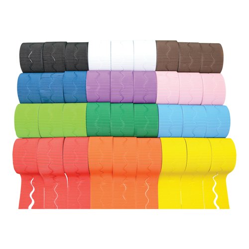 Perfect for edging classroom display boards or framing work, these corrugated display border rolls in assorted bright colours instantly frame display areas, adding a professional finish. Constructed from sturdy corrugated card, ensuring durability and longevity, they remain intact and visually appealing, making them ideal for regular display changes. Colours can reflect the topic or season, adding more interest to classroom bulletin boards and doors. This feature enhances the thematic presentation of art supplies for schools. Supplied in a pack of 20 rolls in assorted colours.